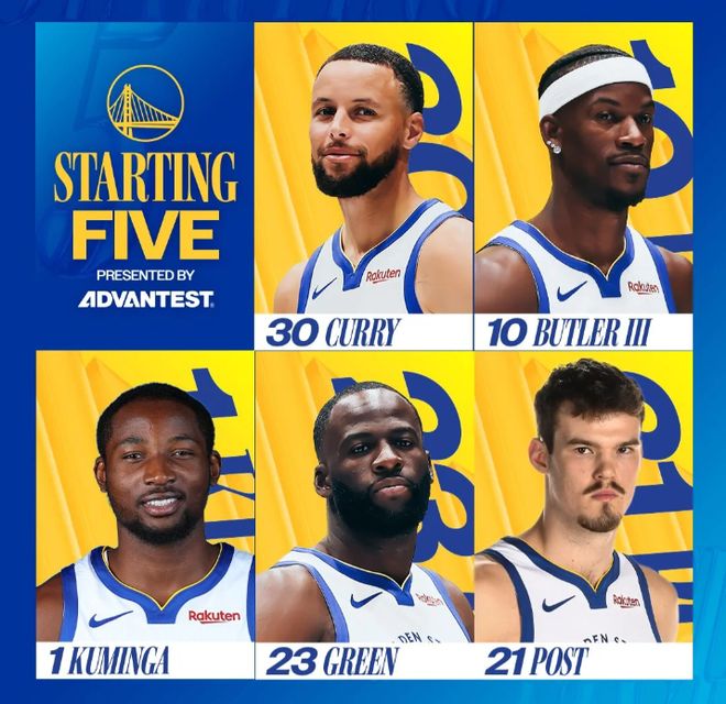赛前,美媒ESPN预测本场比赛的实时胜率,勇士胜率仅有24%,雷霆胜率则高达76%,优势明显。今天比赛,首发阵容方面,勇士队这边,库里复出,科尔排出的最新首发五人组为:斯蒂芬-库里、吉米-巴特勒、乔纳森-库明加、德雷蒙德-格林、昆滕-波斯特;雷霆队这边,首发阵容则为:谢伊-吉尔杰斯-亚历山大、吕冈茨-多尔特、卡森-华莱士、彻特-霍姆格伦和以赛亚-哈尔滕施泰因。